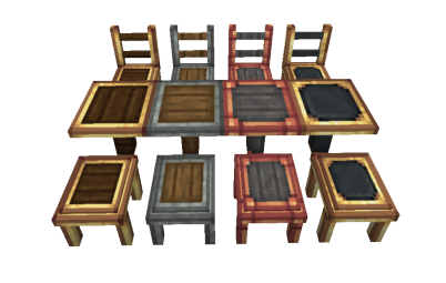 Entre las características más destacadas de este mod se encuentran las mesas, disponibles en cuatro variantes basadas en los materiales icónicos del mod Create: Andesite Casing, Copper Casing, Railway Casing y Brass Casing. Cada silla está diseñada para combinar con los materiales de las mesas, ofreciendo una estética armoniosa. Además, los taburetes son pequeños y prácticos, ideales para rincones acogedores o talleres industriales.