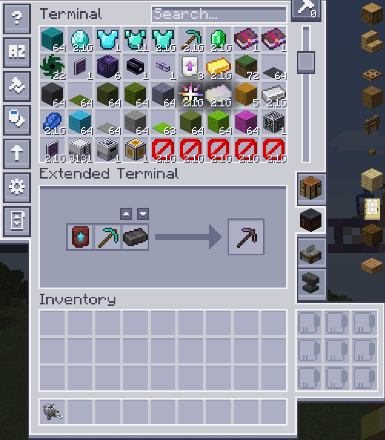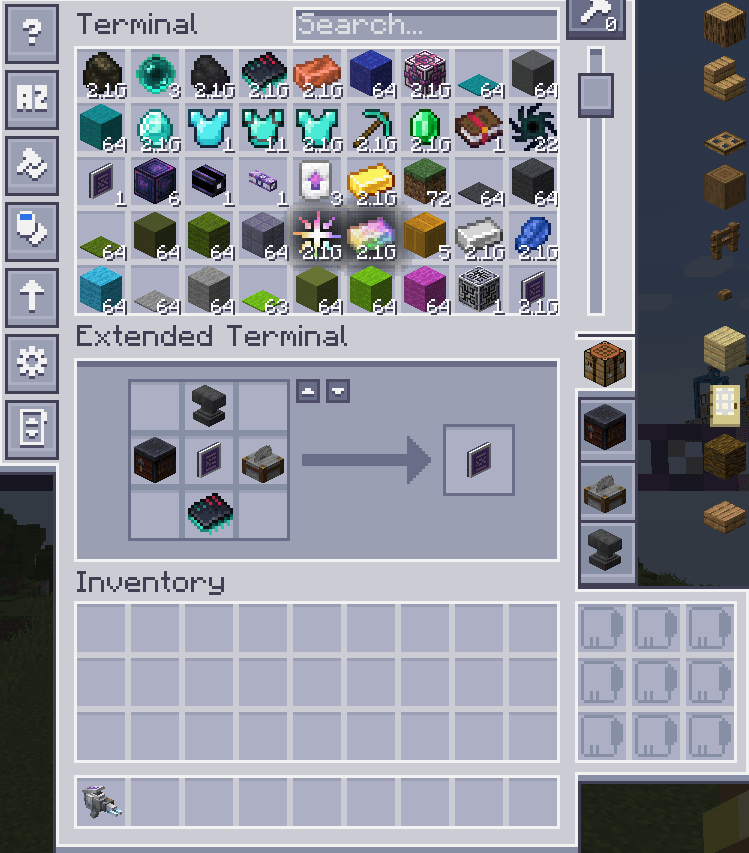 Una de las características más destacadas de Extended Terminal es su soporte para EMI y JEI, lo que te permite acceder a recetas y objetos de manera rápida y eficiente. Además, este mod permite el uso de un sistema de crafteo extendido, que va más allá del tradicional 3x3, permitiendo configuraciones personalizadas que se adaptan a tus necesidades. Esto es ideal para aquellos que buscan maximizar su eficiencia en el crafteo y la creación de objetos complejos.